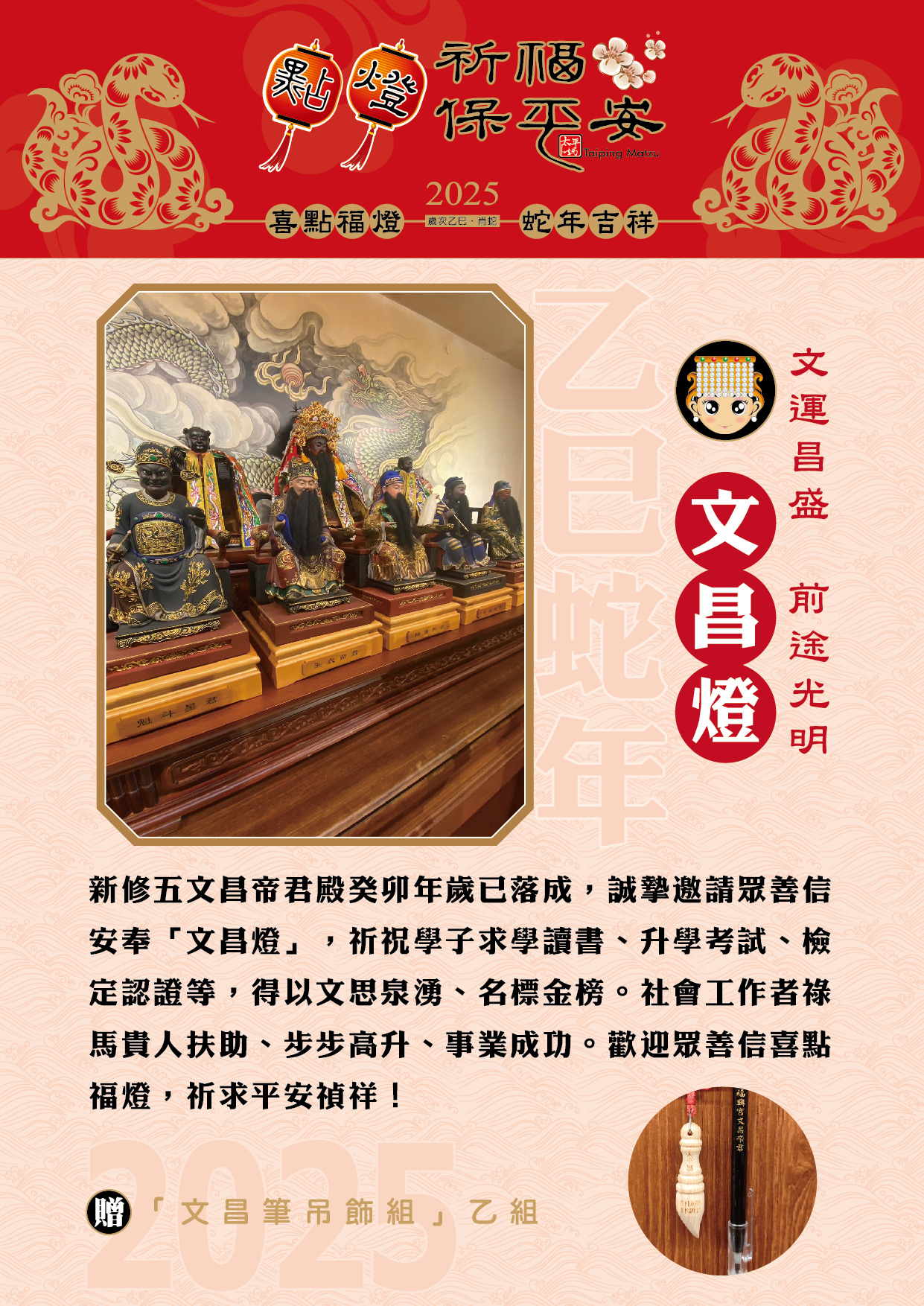 * 安奉媽祖平安燈、元辰光明燈者,可獲乙巳年掛曆乙支。