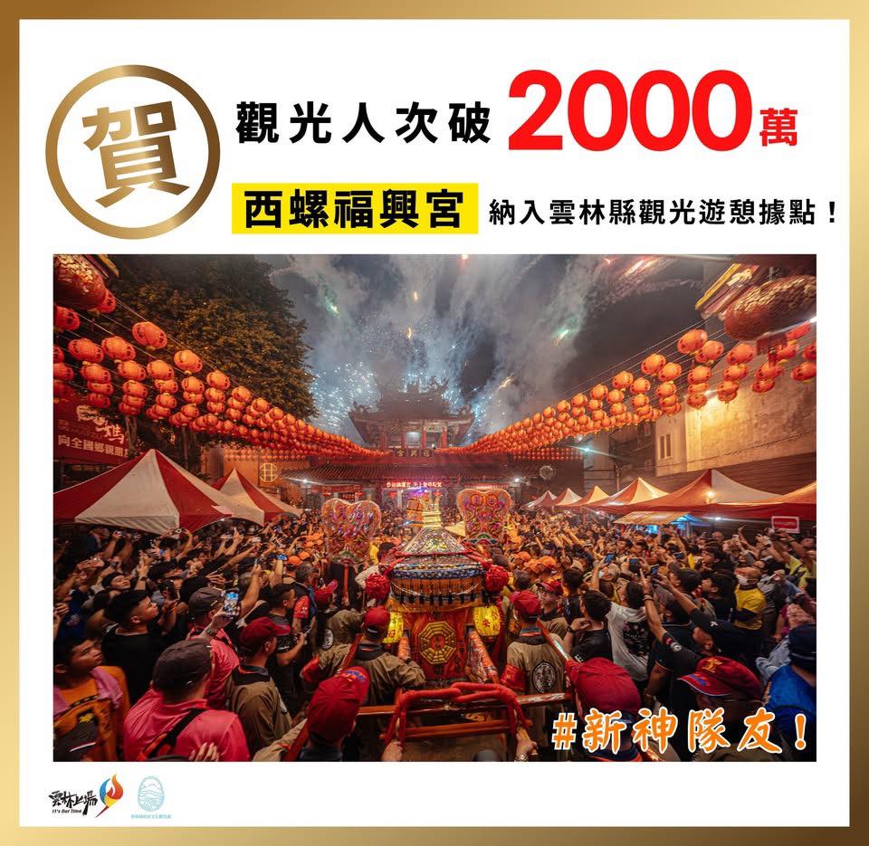 今年雲林創造突破2000萬觀光人次的傲人成績,顯現人民對雲林在地文化的熱忱外,更代表雲林縣觀光潛能深厚。竭誠歡迎全國各地鄉親來雲林𨑨迌,參拜 #西螺媽祖太平媽 、品嚐西螺在地美食,感受西螺濃厚的人情味,新的一年諸事順遂、太平