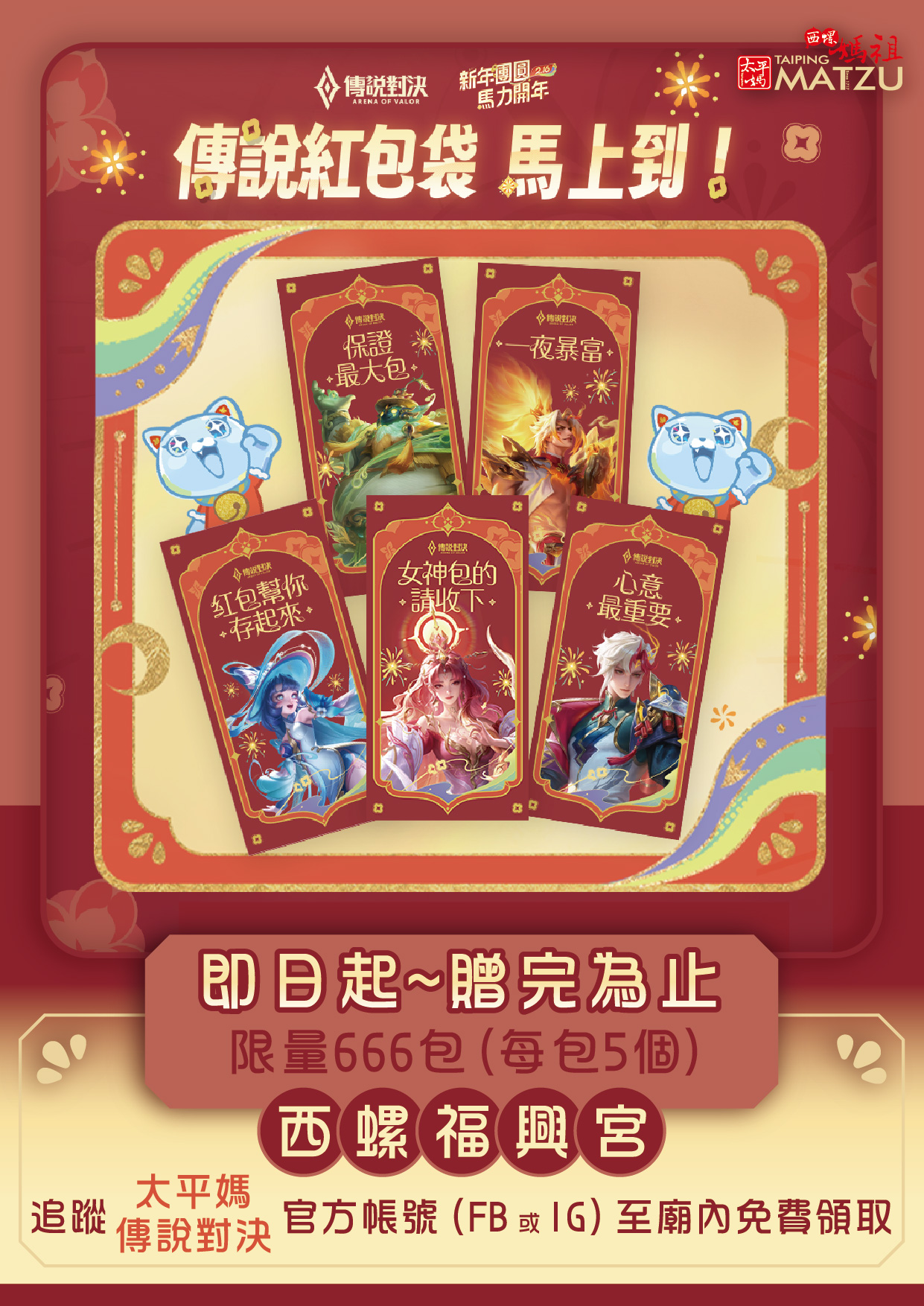 即日起開放傳說限定的馬年紅包與粉絲好朋友結緣,只要追蹤西螺福興宮太平媽與Garena 傳說對決官方帳號(臉書或IG帳號),即🉑向本宮櫃檯行政人員免費索取