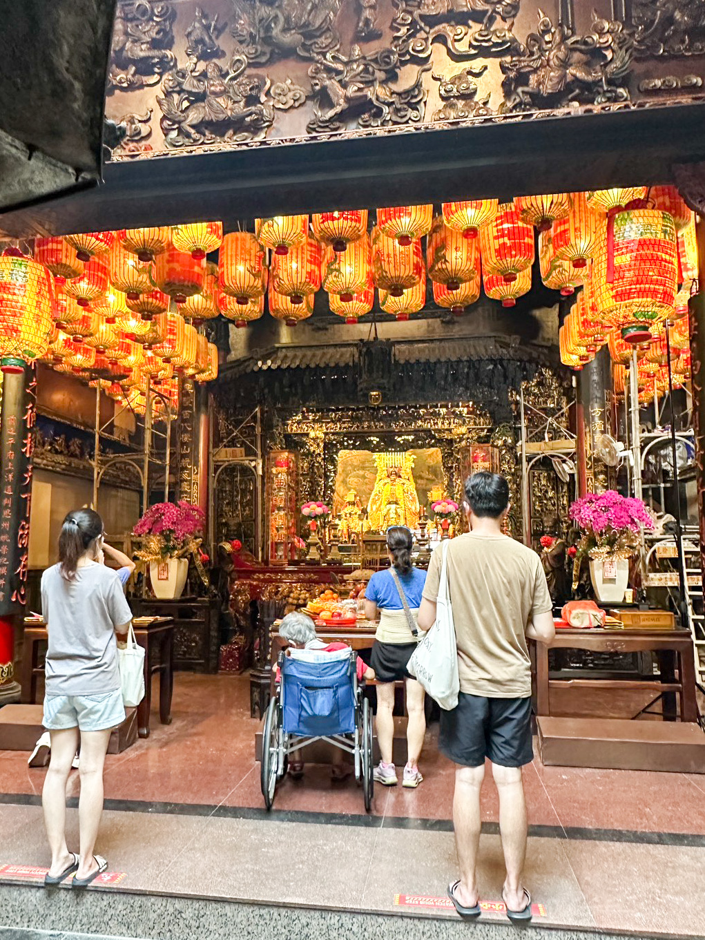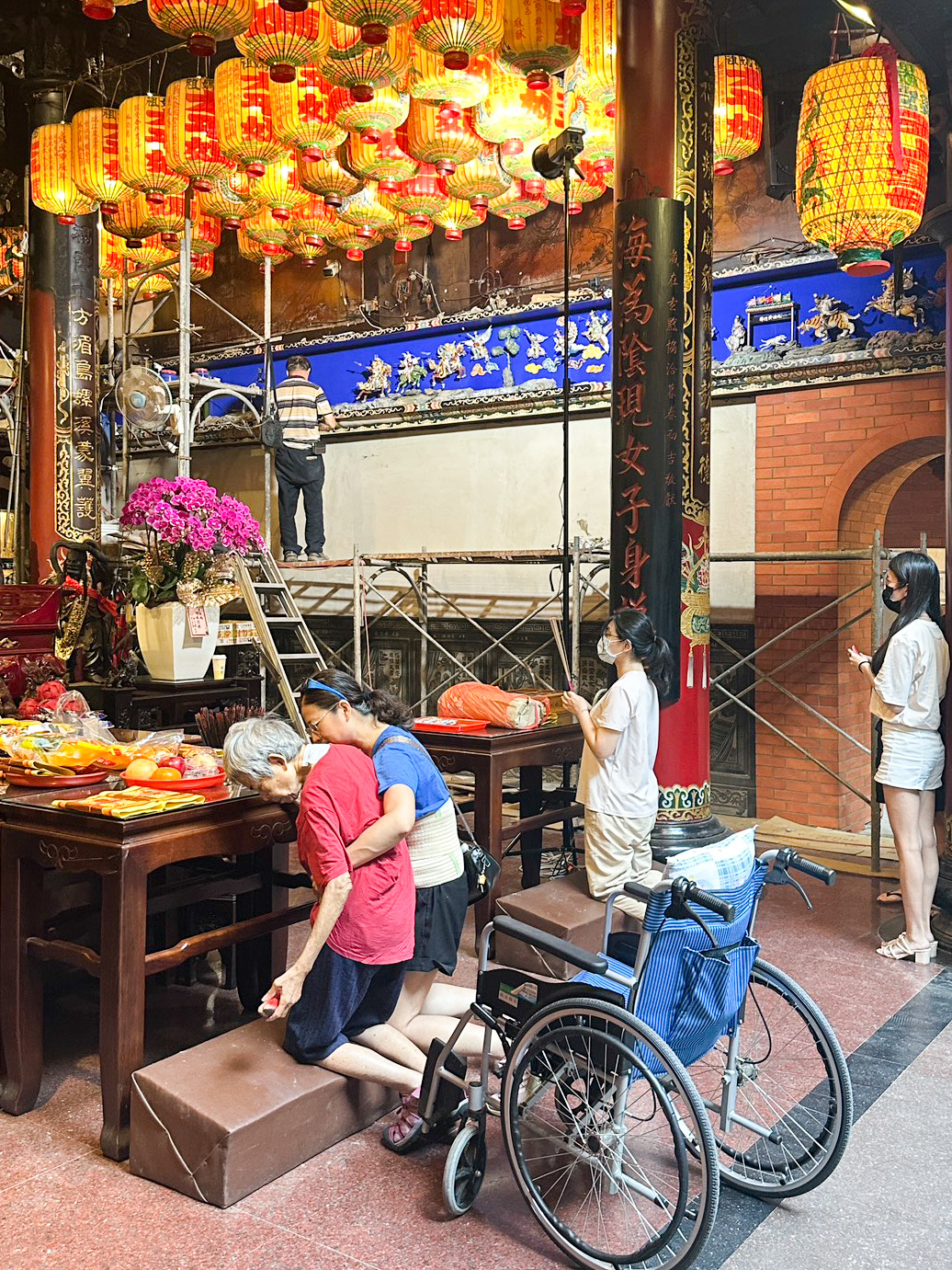 一位白髮蒼蒼、坐在輪椅上的老人家,在家人的細心攙扶下,緩緩伏跪於太平媽案前。雙手顫顫巍巍卻誠心捧起筊杯,將其信念與祈求傾注其中。