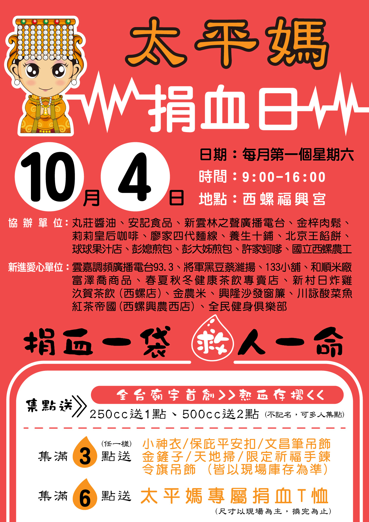 10月4日(禮拜六),上午9點至下午4點, #西螺福興宮 廟埕捐血活動