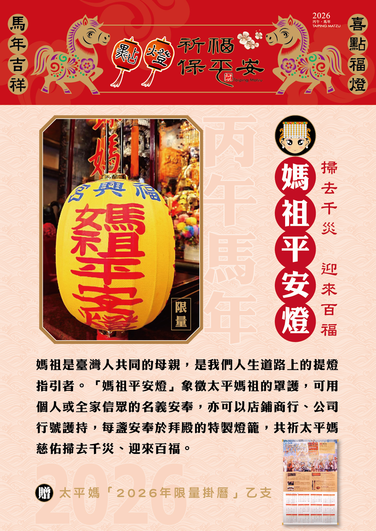 奉點此燈可使用個人或全家信眾之名義,亦可以店鋪商行、公司行號護持,每一盞安奉於拜殿的特製燈籠 共祈太平媽慈佑掃去千災、迎來百福。