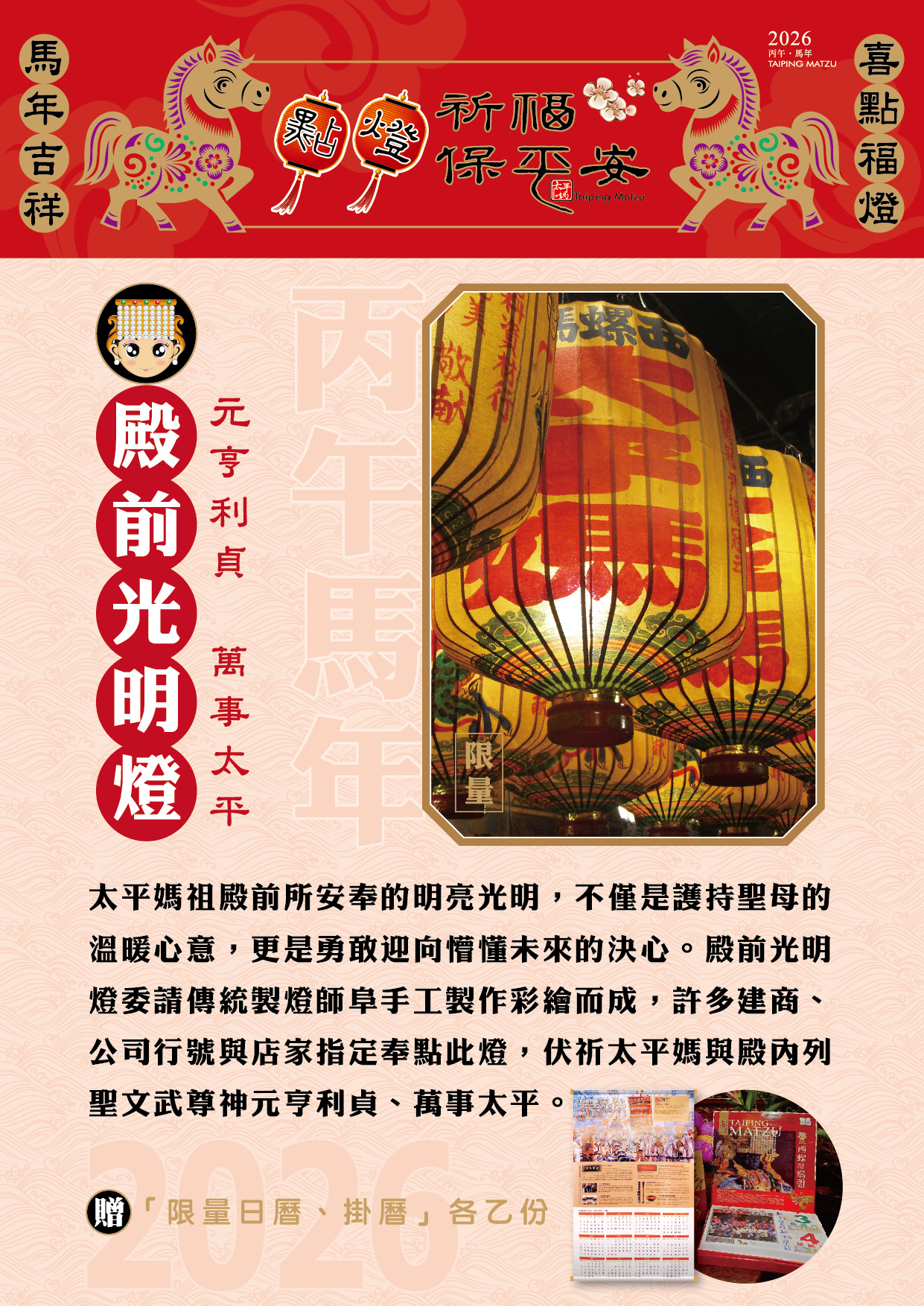 * 安奉媽祖平安燈或元辰光明燈者,可獲掛曆乙支。