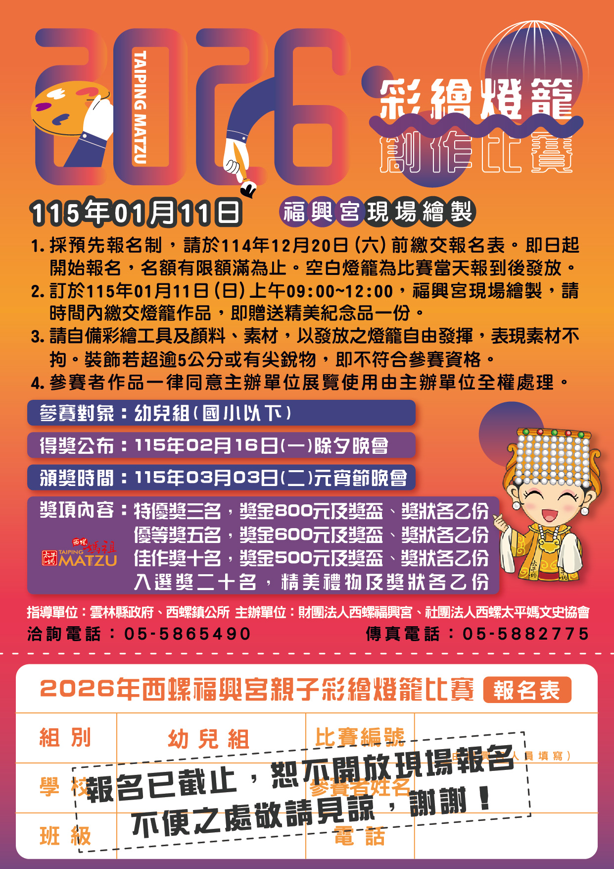 太平媽貼心提醒大家:115年1月11日(禮拜天)上午9點至12點,有 #事先 完成報名的朋友們敬請自備彩繪顏料及相關素材,比賽當天於現場報到、領取燈籠,為新春許下美好的心願,也透過斑斕的色彩為童年留下美好的時光