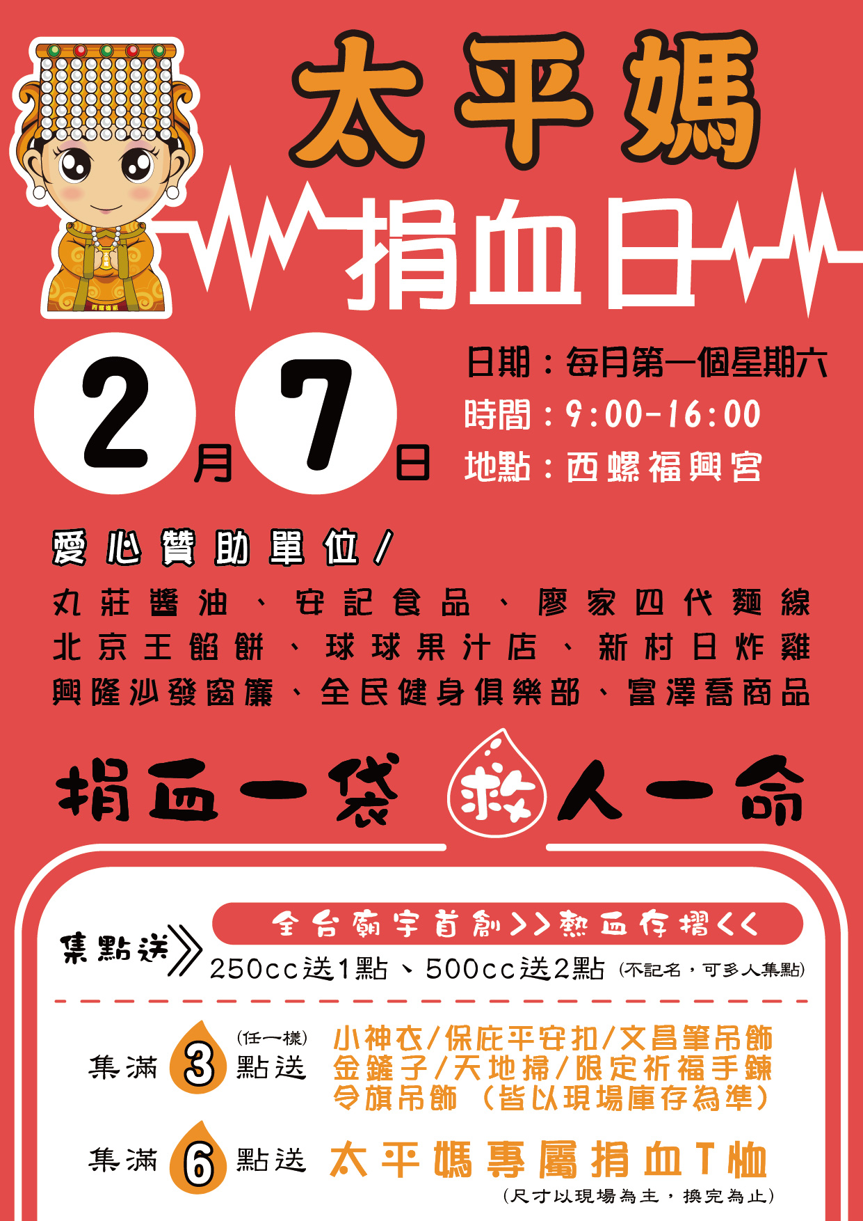 2月7日(禮拜六),上午9點至下午4點,#西螺福興宮 廟埕捐血活動