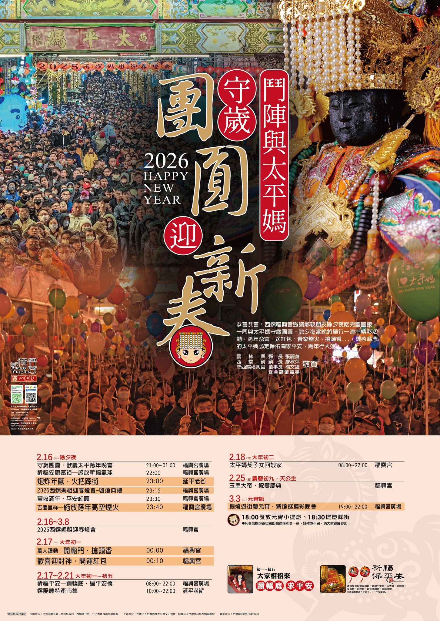 敬邀全國各地信眾除夕夜吃完年夜飯,一起來福興宮陪太平媽守歲團圓 ,新春期間也歡迎逐家做伙來西螺走春,觀賞國際級的迎春燈會,祈願新的一年充滿光明與媽祖的祝福