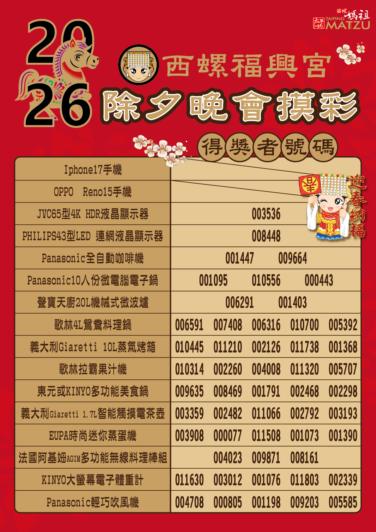 恭喜所有得獎者,敬請獲獎民眾於2月26日(農曆正月初十 禮拜四)晚上10點關廟門前至本宮領獎,敬祝 大家 #神馬攏賀 、 #駿馬迎春